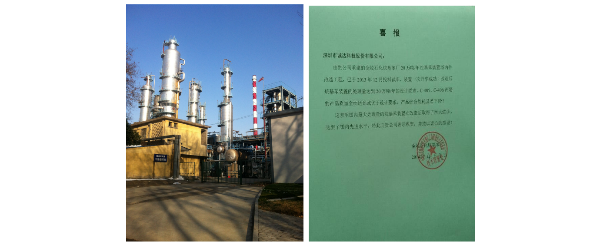 1999年至今,深圳诚达承接了南京金桐石油化工有限公司10万吨/年烷基苯、江苏金桐石油化工有限公司10万吨/年烷基苯、中石化金陵分公司10万吨/年烷基苯项目、中石油抚顺洗化厂13.6万吨/年烷基苯(2套)、江苏金桐表面活性剂有限公司江北新建10万吨/年烷基苯项目、中石化金陵分公司20万吨/年烷基苯等多套烷基苯新建(扩建)项目,开车效果均优于设计要求,为客户节能增效提交了满意答卷。