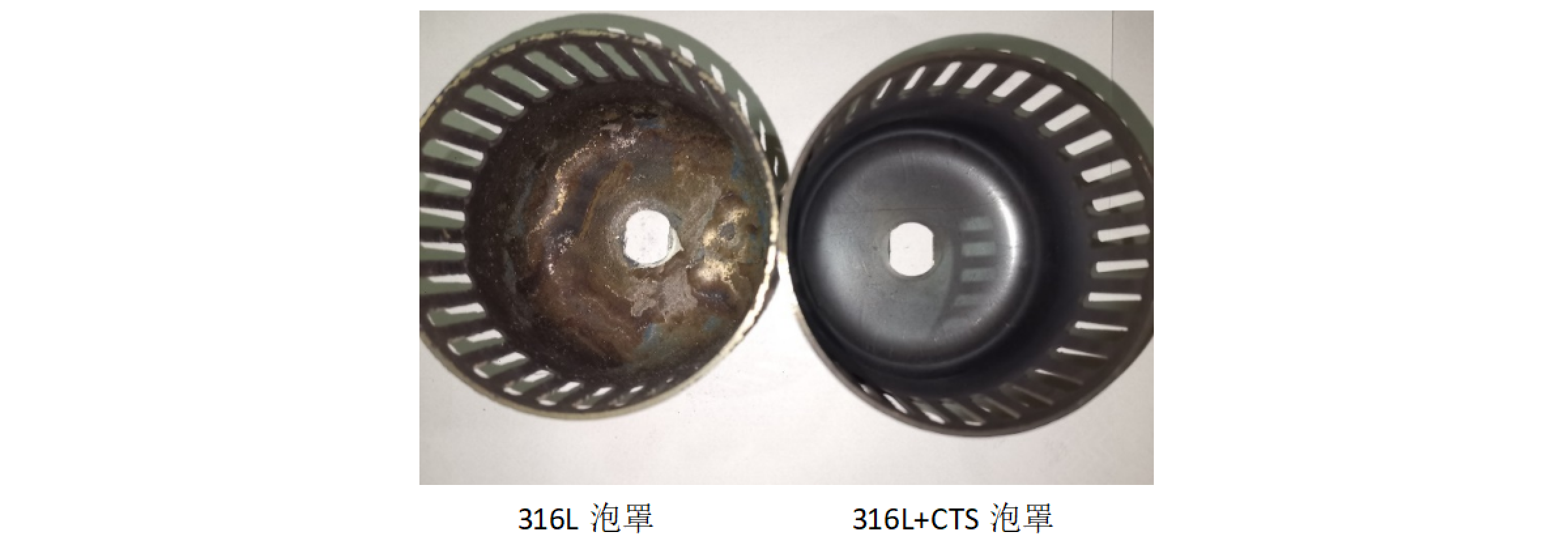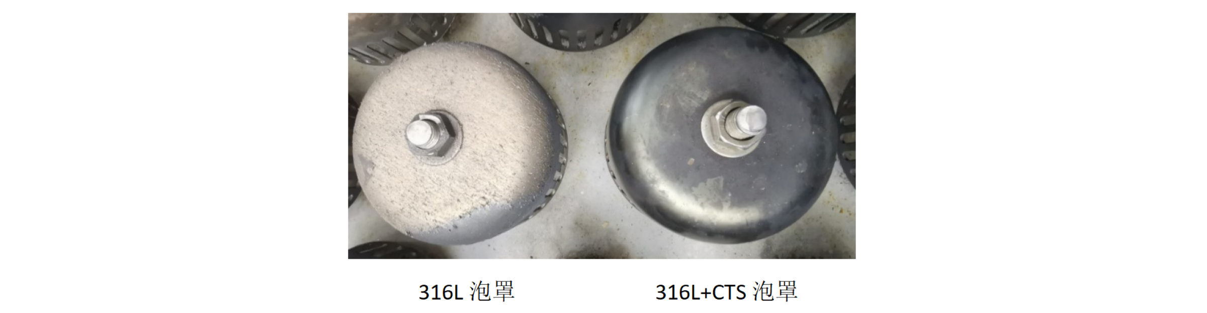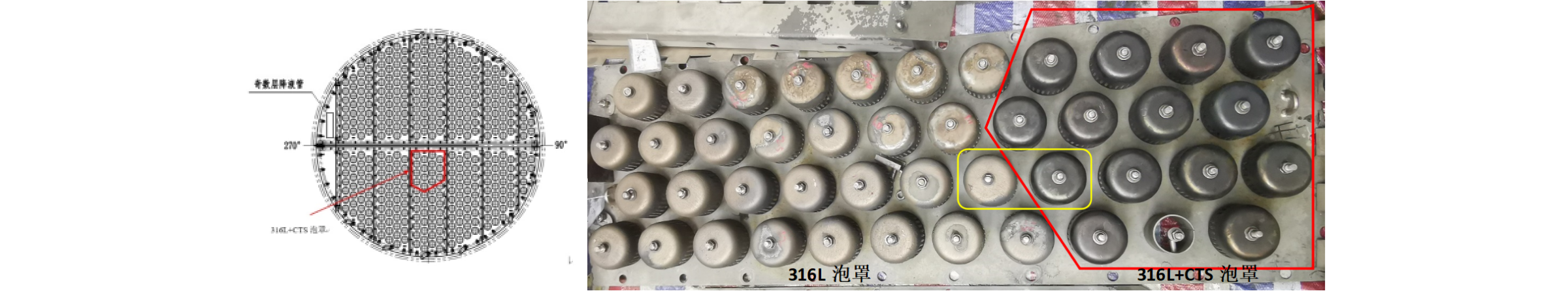 根据检修现场观测,316L泡罩已经无法继续使用,316L+CTS泡罩在氨洗塔的腐蚀环境下,未发生腐蚀,可以满足继续使用的要求。