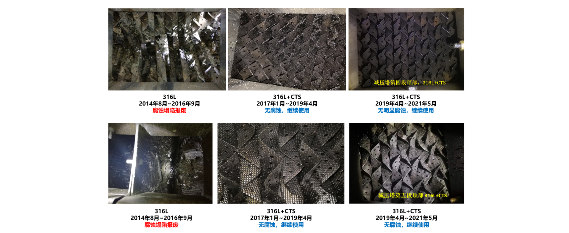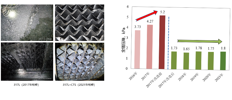 316L+CTS填料从2017年开始使用,2019年、2021年检修查看填料均为发现腐蚀,至今(2023年)仍在继续使用。