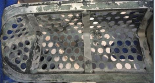 2022年3月停车检修,氨洗塔泡罩塔盘拆出清洗检查,未经CTS处理的316L泡罩发生明显腐蚀,泡罩腐蚀减薄严重,原泡罩厚度为2mm,部分泡罩测厚仅1.1mm,部分泡罩腐蚀成纸片状并局部位置腐蚀穿孔。316L+CTS泡罩均未发生腐蚀,表面完好,CTS膜层清晰可见,现场照片如下: