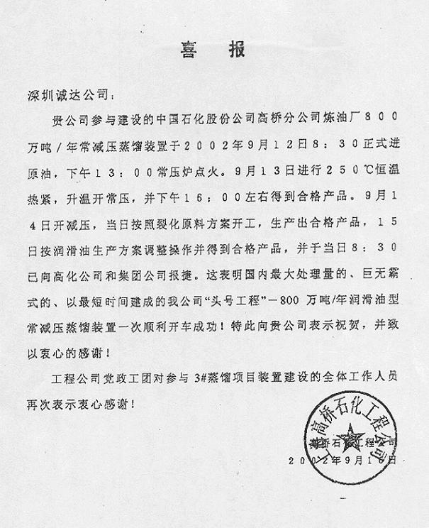 2002年,炼油厂新建800万吨/年常减压蒸馏装置减压塔(Φ4800/Φ10200mm),为当年全国最大的减压塔,要求主要设备国产化,深圳诚达承接全塔液体分布器设计制造任务。