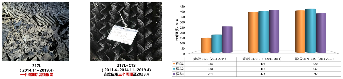 317L+CTS填料经过2个周期的应用后结构完整,抗拉强度处于正常水平,继续使用至第3周期。