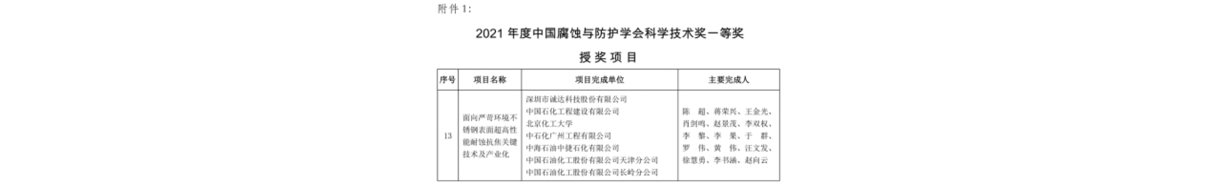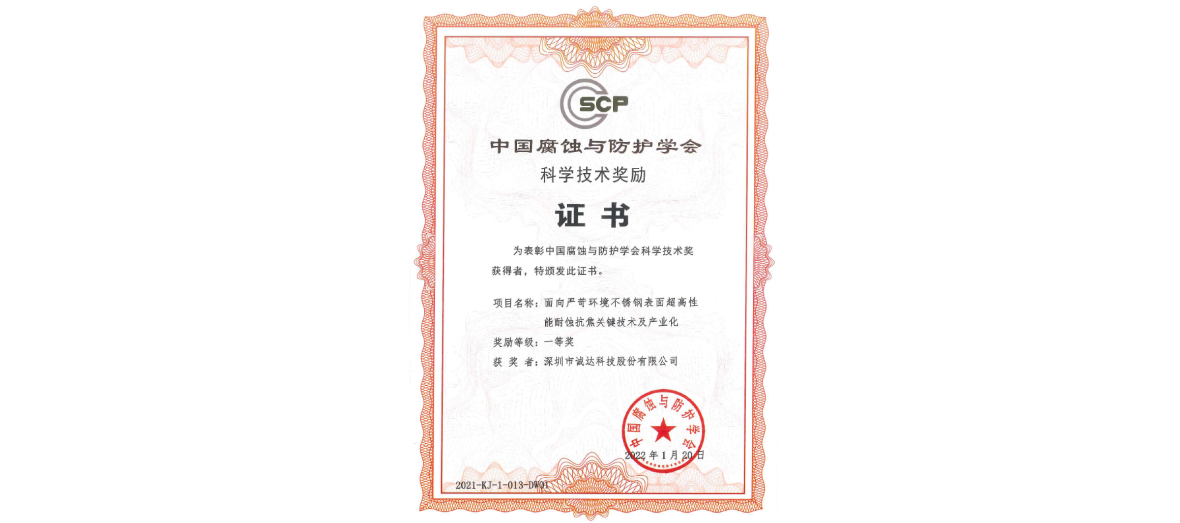 诚达科技会同中国石化工程建设公司、北京化工大学、中石化广州工程公司、中海油中捷石化公司、中石化天津分公司和中石化长岭分公司等七家单位联合申报的《面向严苛环境不锈钢表面超高性能耐蚀抗焦关键技术及产业化》项目,经过由我国腐蚀与防护领域的科研、教育、工程等领域知名专家组成的评审委员会严格评审,经激烈角逐,脱颖而出,荣获代表中国腐蚀与防护最高技术水平的一等奖。这既是对诚达科技扎根不锈钢耐蚀抗焦技术潜心30年研究成果的肯定,也是对诚达科技的技术水平处于国内领先地位的认可。